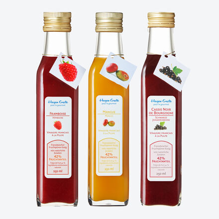 42 % Fruchtpüree aus französischen Himbeeren, Essig 8°, Kristallzucker, Pektin. Kann Spuren von Schalenfrüchten unmd Sesam enthalten.