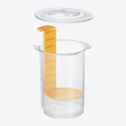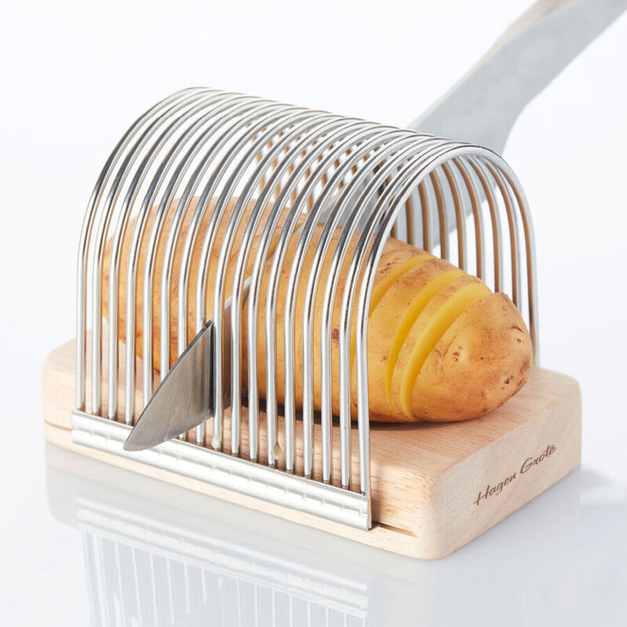 Das Geheimnis der bekannten, mit Butter und Parmesan gefüllten "Hasselback-Kartoffeln" aus dem gleichnamigen Stockholmer Restaurant, sind gleichmäßige, feine Schnitte, die die Kartoffel nicht durchtrennen. Die ungeschälte Kartoffel wird dazu in der Mulde des Holzbretts fixiert, das Messer durch die Gitterstreben des Oberteils geführt. Das Innere wird im Ofen butterzart und die Haut knusprig. Auch für andere Gemüse und Fleisch.