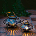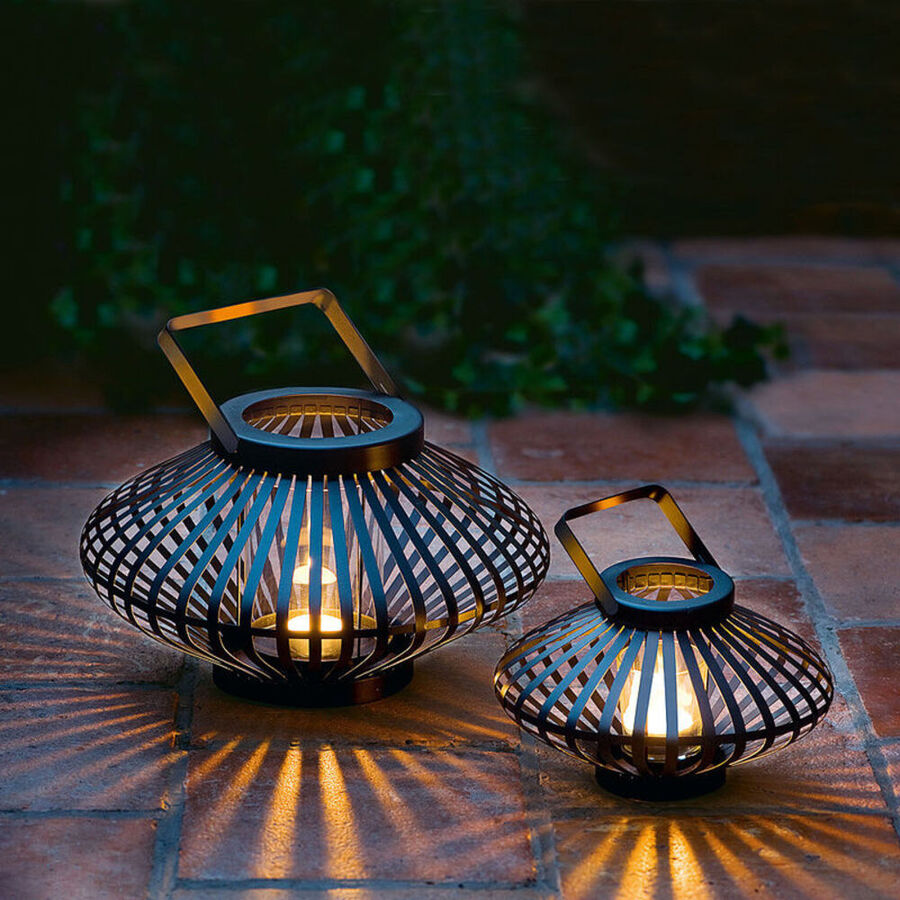 Einst eine Lichtquelle des täglichen Gebrauchs in Tempelanlagen und herrschaftlichen Häusern, sind sie heute "nur noch" ein überaus schmückendes Element. Der Metallkorb, früher wichtiger Flammenschutz, erzeugt das lebendige Licht- und Schattenspiel. Im Haus, auf der Terrasse oder im Garten ist ihr romantischer Lichtschein eine überaus dekorative Bereicherung. In Handarbeit werden die einzelnen Lamellen aus lackiertem Eisen verschweißt. Glaseinsätze für normale oder Jumbo-Teelichter schützen die Flammen der Kerzen vor Wind. Am Tragegriff lassen sich die Windlicht- Laternen sicher und bequem transportieren oder aufhängen.