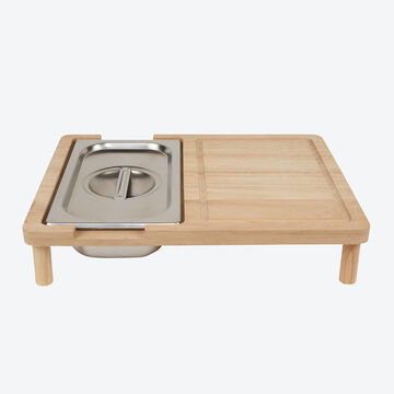 Auf dem robusten, standsicheren Arbeitsbrett fertiggestellte Zutaten kommen sauber getrennt vom Abfall in die herausnehmbare Edelstahlwanne mit Deckel. Vorzüglich verwenden Sie diese auch zum Marinieren oder zur Lagerung von Zutaten und Speisen im Kühlschrank. Flüssigkeit nimmt die umlaufende Saftrille auf. Beine zur platzsparenden Aufbewahrung abnehmbar.