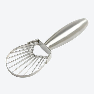 Einfach den Schneider auf eine reife, entsteinte Avocadohälfte setzen und durch das Fruchtfleisch ziehen. Dank angepasster ovaler Form des Werkzeugs wird die Avocadohälfte vollständig ausgelöst. Dabei teilen die robusten Klingen die Frucht in gleichmäßig schöne, appetitliche Scheiben.