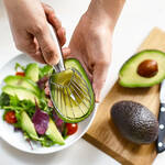 Einfach den Schneider auf eine reife, entsteinte Avocadohälfte setzen und durch das Fruchtfleisch ziehen. Dank angepasster ovaler Form des Werkzeugs wird die Avocadohälfte vollständig ausgelöst. Dabei teilen die robusten Klingen die Frucht in gleichmäßig schöne, appetitliche Scheiben.
