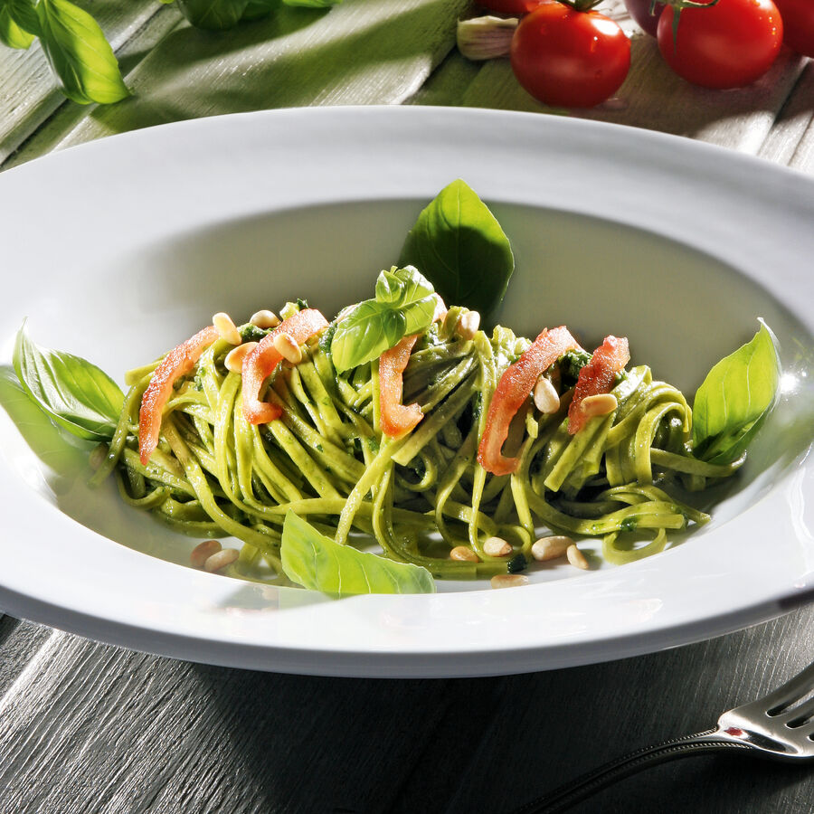 Tagliolini in 4 Minuten knapp al dente kochen. Abgießen, noch feucht in den Topf zurückgeben und sofort mit der Sauce mischen. Auf heißen Tellern mit Tomatenstreifen, Basilikumblättchen und gerösteten Pinienkernen anrichten.