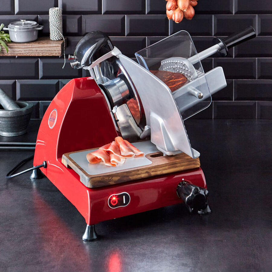 • Mit einer Maschine Fleisch und Schinken so perfekt schneiden wie ein sehr erfahrener Metzger mit der Hand - dieses Ziel hatte sich einst der Niederländer Wilhelmus Adrianus van Berkel gesetzt. Entstanden sind Schneidemaschinen, die als die Besten gelten und weltweit seit mehr als 110 Jahren in Feinkosthandlungen und Restaurants, bei Metzgern und Gourmets gleichermaßen geschätzt werden. Äußerst präzise, fein und zuverlässig schneiden sie Fleisch und Schinken in gleichmäßig dünne Scheiben. Aus einer speziellen Alulegierung gefertigt, erzielen Sie mit der elektrischen Aufschnittmaschine ein perfektes Ergebnis. Das Hohlschliffmesser mit einem Durchmesser von 25 cm ist bis 14 mm stufenlos einstellbar - überaus exakt und millimetergenau. Selbst der Unterschied zwischen 0,5 und 1,0 mm Schnittdicke ist mit bloßem Auge erkennbar. Dank präziser Schnitte fallen kaum Schneidabfälle an. Aufgrund integriertem Schleifapparats ist das Schleifen des Messers spielend leicht. Einfache und sichere Säuberung dank abnehmbarem Schlitten, Schneidblatt bleibt dabei in Sicherheitsposition.