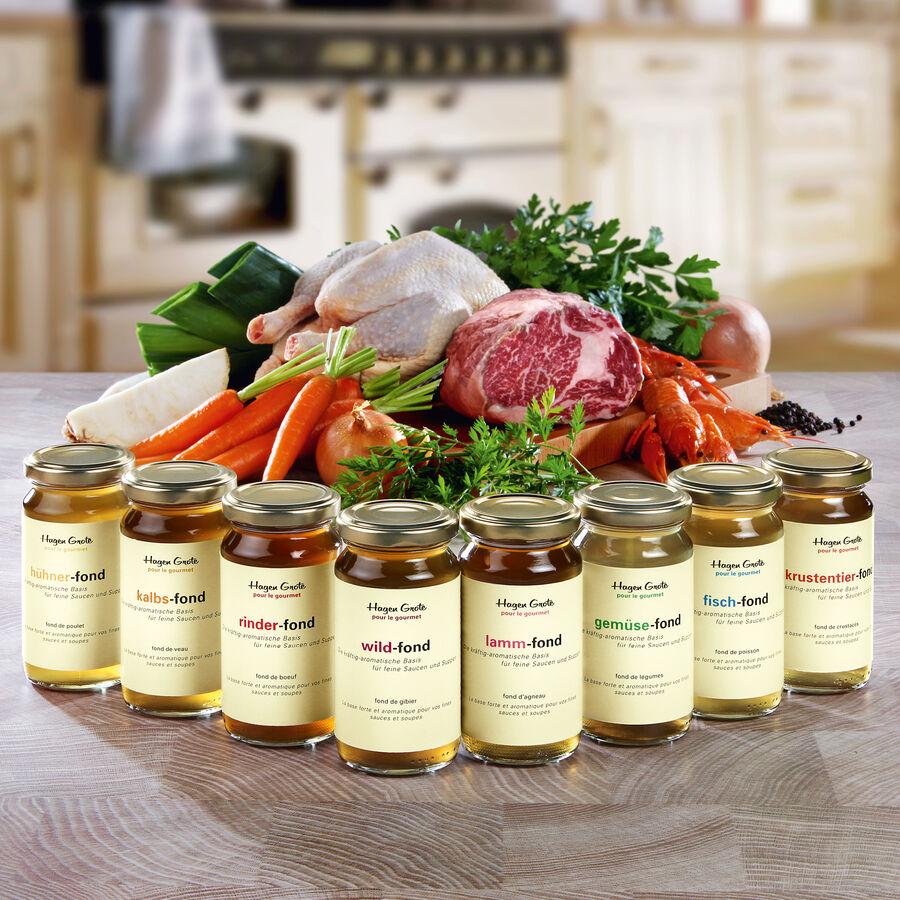 Bei einer Blindverkostung des Magazins "DER FEINSCHMECKER" wählte eine unabhängige Expertenjury den Hagen Grote Fischfond unter 50 Konkurrenten zu den 6 besten. Unsere Fonds fertigen wir nach höchsten kulinarischen Standards. Nur beste natürliche Grundprodukte werden nach traditionellen Methoden verarbeitet. Sie sind die kräftige, aromatische Basis aller guten Saucen und Suppen. Vorreduziert und kräftig im Geschmack.Je 3 Gläser à 200 ml.