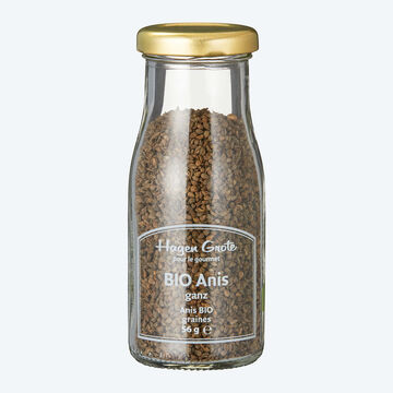 Anis-Samen finden als Gewürz und Heilpflanze (Husten, Verdauungsbeschwerden) Verwendung. Seine würzig herben ätherischen Öle verfeinern Marmeladen, Brot, Backwaren und sind Basis einer Vielzahl von Likören. Würzt feine Suppen, Saucen, Fisch, Meeresfrüchte.