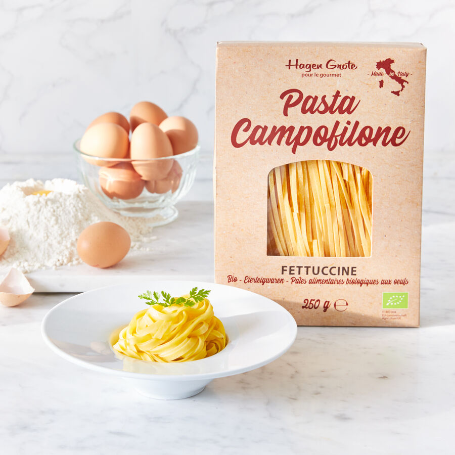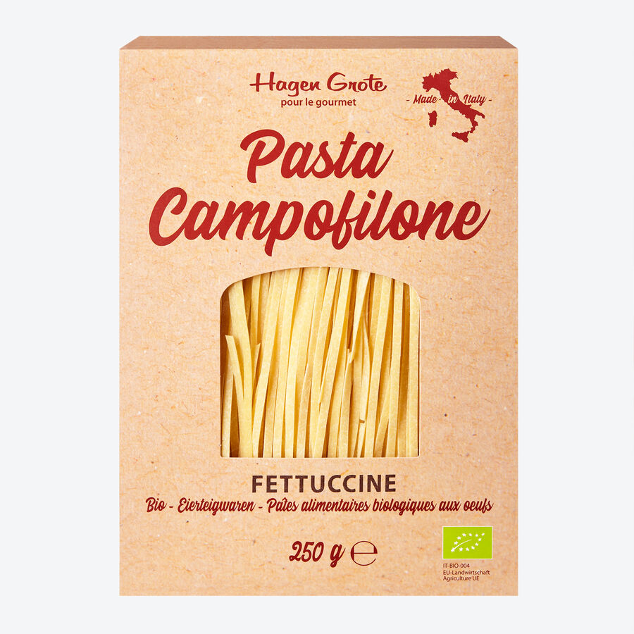 Italiens berühmteste Frischei-Fettuccine werden in einzigartiger BIO-Qualität für Hagen Grote in Campofilone, dem prominentesten Pastadorf Italiens, gefertigt. Mit luxuriösen 7-8 Eiern auf 1 kg Mehl entstehen überwiegend in Handarbeit diese einzigartigen Nudeln. Kein Tropfen Wasser, nur absolut frische BIO-Eier und BIO-Hartweizengrieß werden ganz langsam zu Teig verknetet. Hauchdünn gewalzt wird er wie Strudelteig gefaltet und in 4 mm Breite zu feinsten Fettuccine aufgeschnitten. In Einzellagen trocknet die hauchfeine Pasta auf Spezialpapier mehrere Tage. Das Ergebnis: Wunderbarer Geschmack, goldgelbe Farbe, feine feste Konsistenz, wesentlich ergiebiger im Volumen als übliche Nudeln, minimale Kochzeiten von 2-3 Minuten. Die Fettuccine sind flexibel verwendbar und passen sowohl zu Fleisch- als auch Fisch- und Gemüsesaucen.
