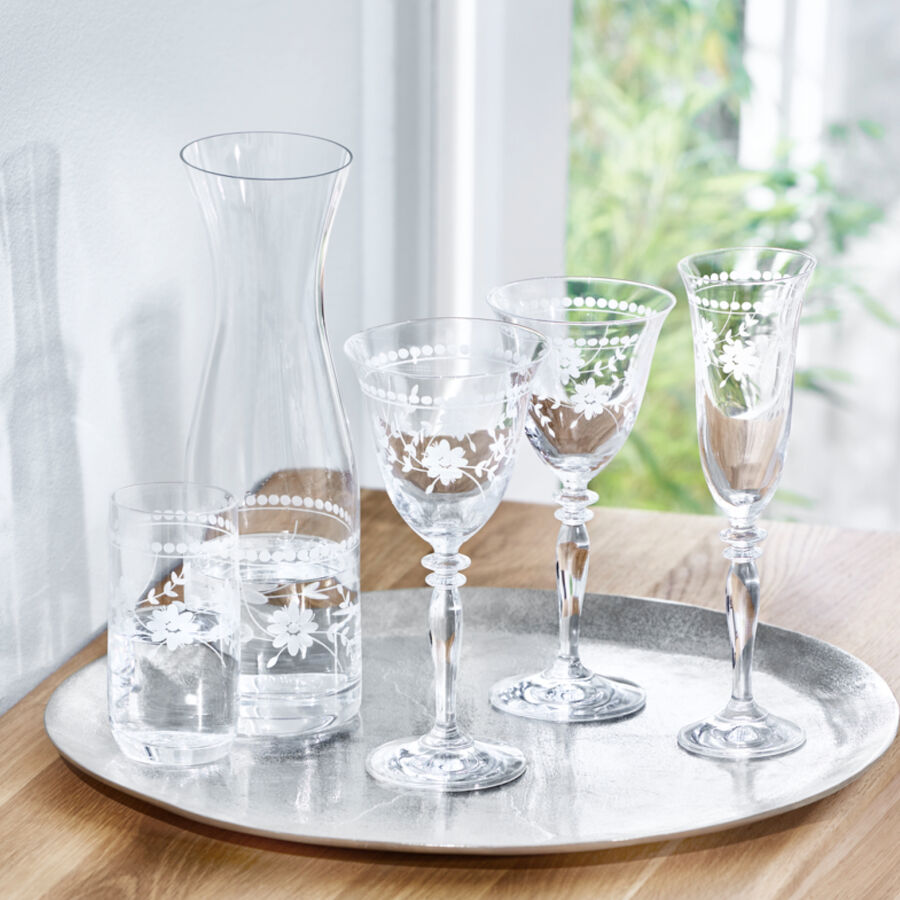 Böhmische Glasbläserkunst ermöglicht die klassische Fertigung dieser wunderschönen Vintage-Gläser. Stilisierte Blüten und Ranken veredeln die Gläser dauerhaft dank feinster Pantografie-Technik. Mit herausragender Klarheit und Brillanz genügen sie anspruchsvollsten Qualitätskriterien.