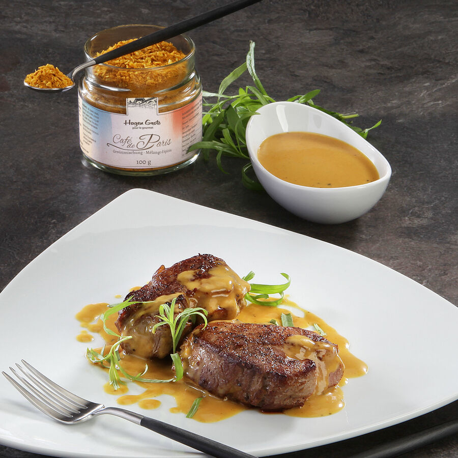 1930 entwickelte Monsieur Boubier in seinem Genfer Restaurant "Café de Paris" die gleichnamige Butter. Ihr einzigartiger und exquisiter Geschmack überzeugte sofort und wird bis heute weltweit geschätzt. In unserer Delikatessenmanufaktur entstand diese spezielle und exklusive "Café de Paris"-Gewürzmischung. Zutaten wie Kurkuma, Pfeffer, Curry und andere sorgen dabei für ein intensives Aroma. Verwöhnen Sie Ihre Gäste mit der berühmten "Café de Paris"-Butter oder -Sauce, die Ihnen mit unserer Gewürzmischung ganz einfach gelingt. Passt auch zum Würzen von Fisch und Meeresfrüchten, Fleisch und Gratins.