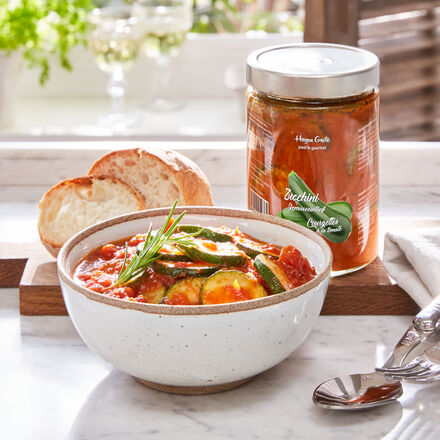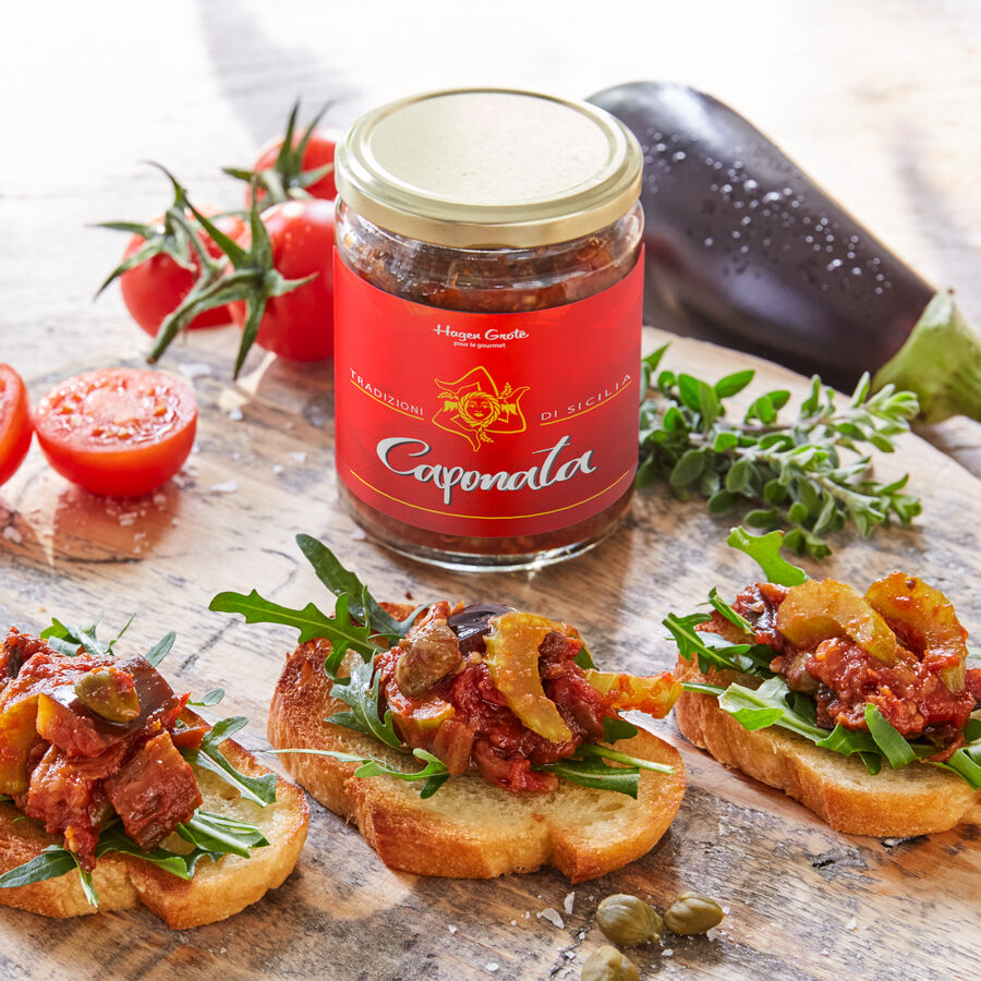 Es ist ein Erbe der Araber, die auf der Insel die Aubergine einführten. Nicht nur Caponata, viele Rezepte der vorzüglichen sizilianischen Küche prägen kulinarische Elemente der 260 Jahre währenden arabischen Herrschaft über die Insel. Das klassisch zubereitete Gericht enthält zur Hälfte Auberginen wunderbar samtiger Konsistenz, kombiniert mit Siccagno-Tomaten. Diese einzigartig würzige, nur auf Sizilien wachsende Tomate, ist seit 2012 von Slow Food geschützt. Sie gedeiht im Inselinneren auf 800 m Höhe im Valle del Bilici ohne jegliche Bewässerung bei Sommertemperaturen über 40 °C. Kontrastierende Aromen von Bleichsellerie, Kapern, nativem Olivenöl und etwas Süße, abgeschmeckt mit einem schwachen Hauch von Essig, bereichern das Gericht. Genießen Sie dieses einzigartige Gemüseragout mit grobem italienischem Weißbrot, kalt oder erwärmt, als kulinarische Vorspeise, als Beilage zu Fisch oder Grillfleisch.
