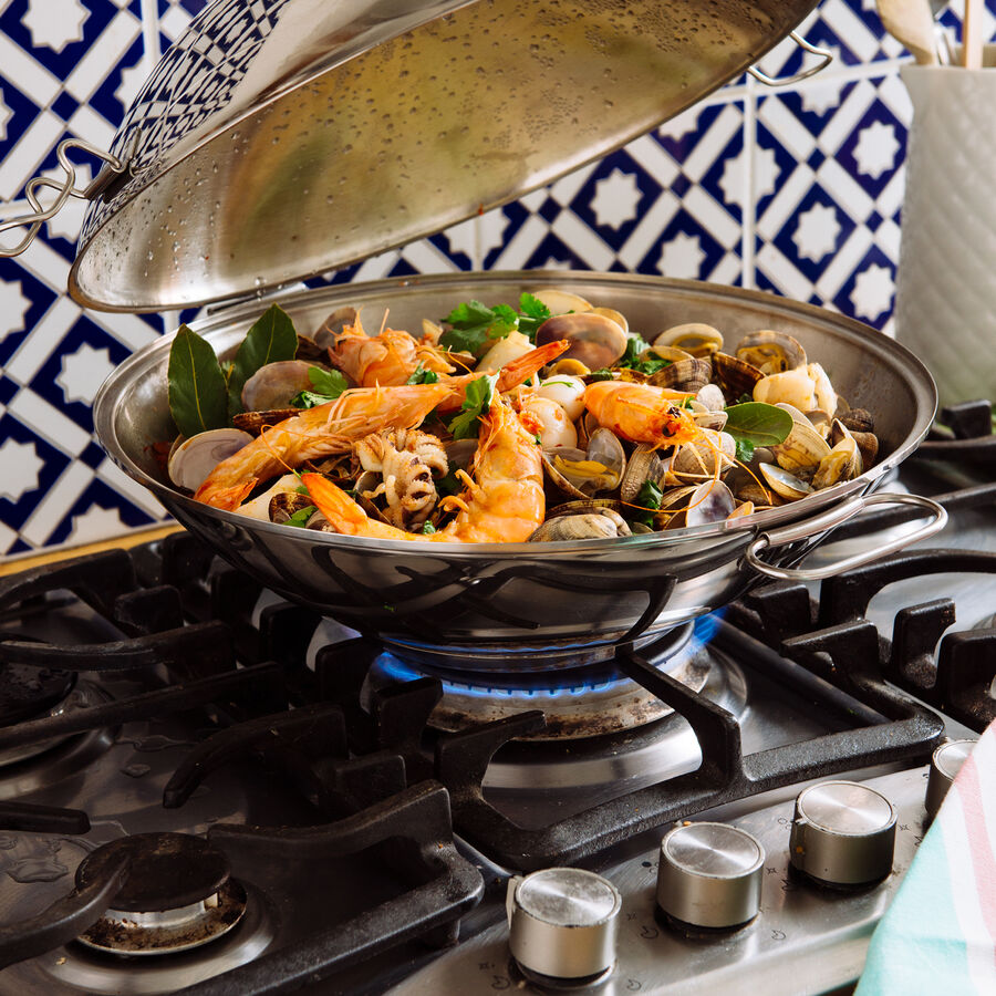 4 Cataplana vorsichtig öffnen. Fisch, beide Sorten Muscheln und die Garnelen zufügen. Gewaschenen Koriander fein hacken und über das Gericht streuen. Wieder verschließen und auf lebhafter Flamme 10 Minuten garen.