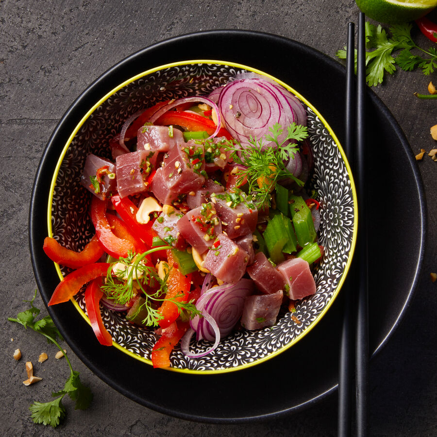 Das klein geschnittene Gemüse salzen und pfeffern. Mit grob gehackten Cashew-Kernen und dem Sesamöl gemischt in die Bowls verteilen. Thunfisch-Ceviche auf die Gemüse geben.