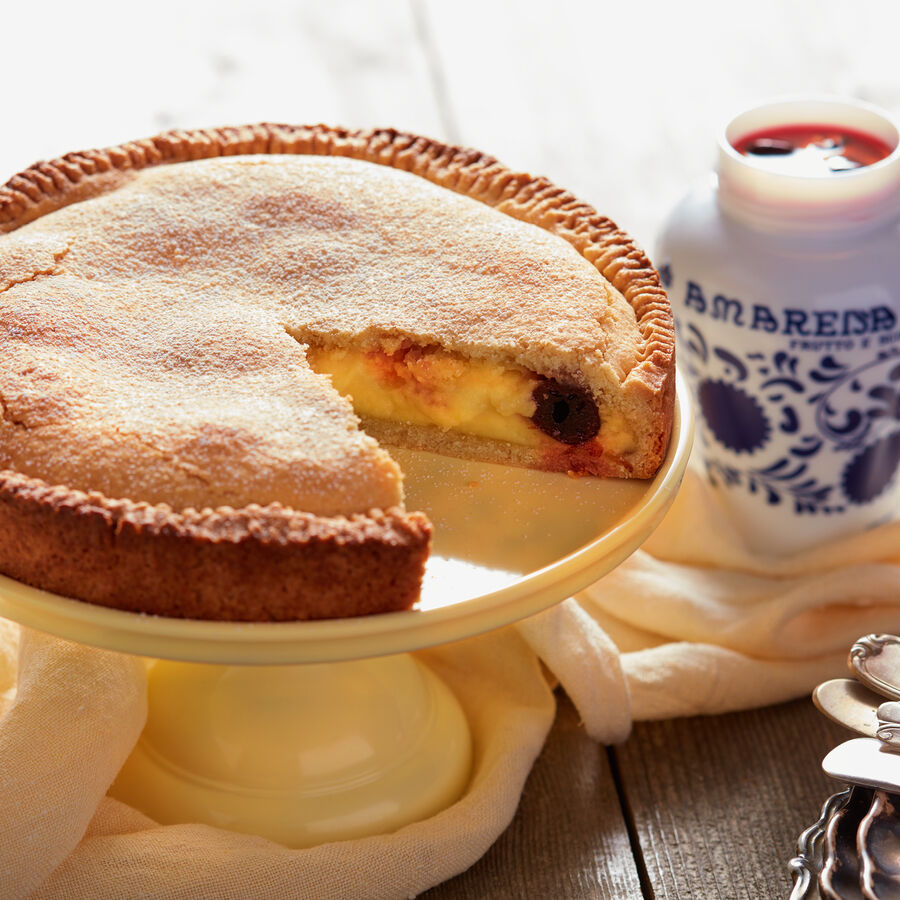 4 Den Backofen auf 170 °C Ober-/Unterhitze vorheizen. Die Hälfte des Teigs zu einer 5 mm dicken Schicht ausrollen. Die Springform mit etwas Butter einfetten und mit Mehl leicht bestäuben. Teig in die Form legen und am Rand hochziehen, dabei den Boden mehrfach mit einer Gabel einstechen. Die Tortencreme in die Form gießen und mit dem Teig bündig glätten, um eine gleichmäßige Oberfläche zu erhalten. Dann die Amarena Kirschen darauflegen.