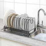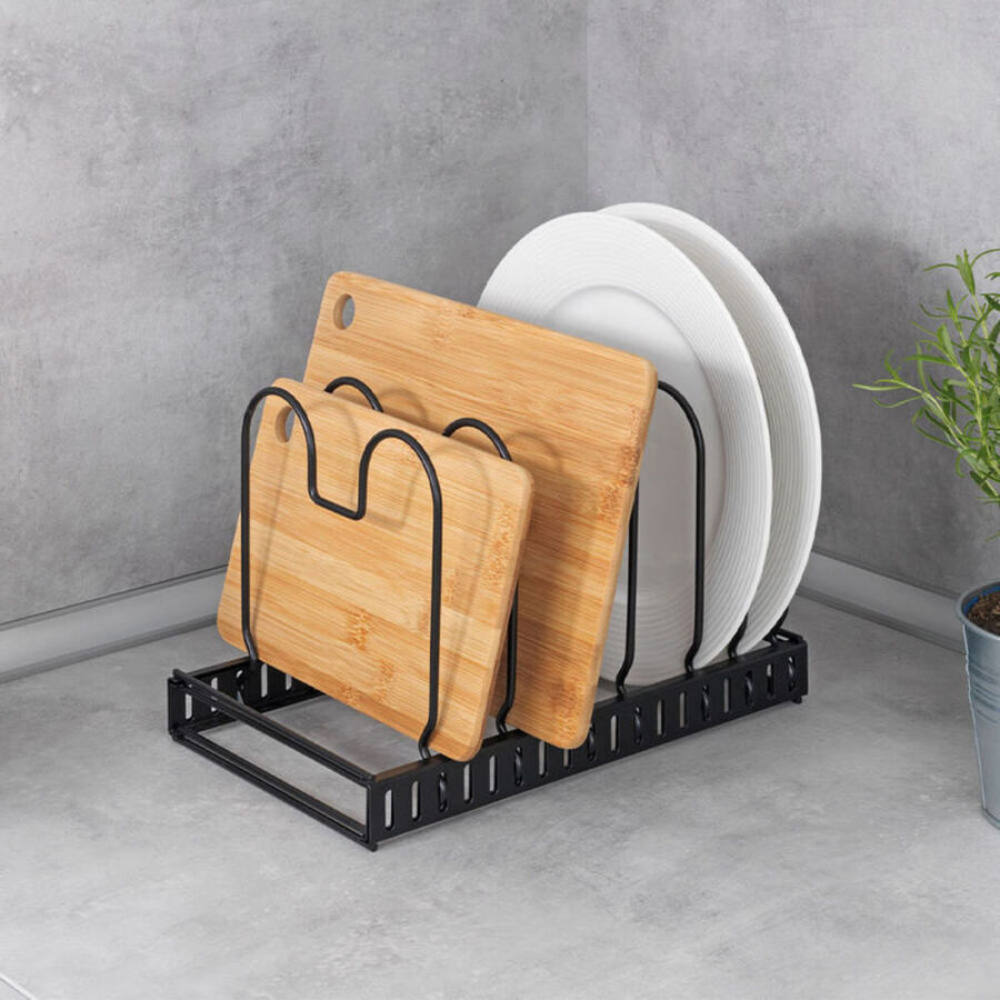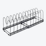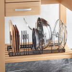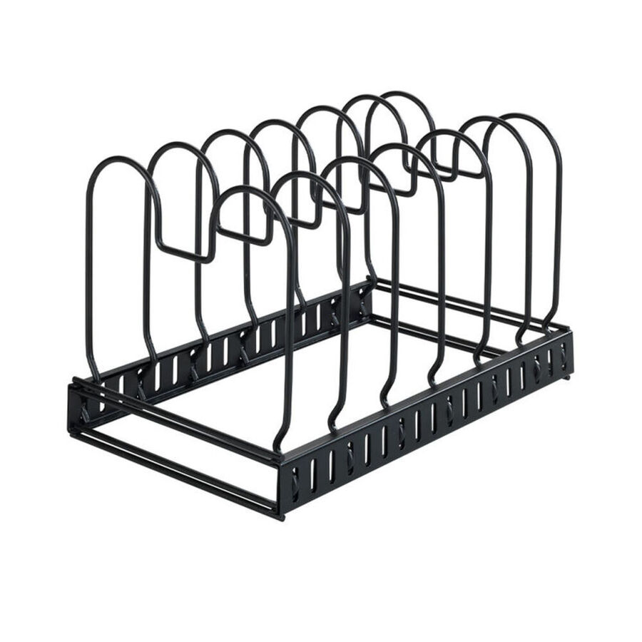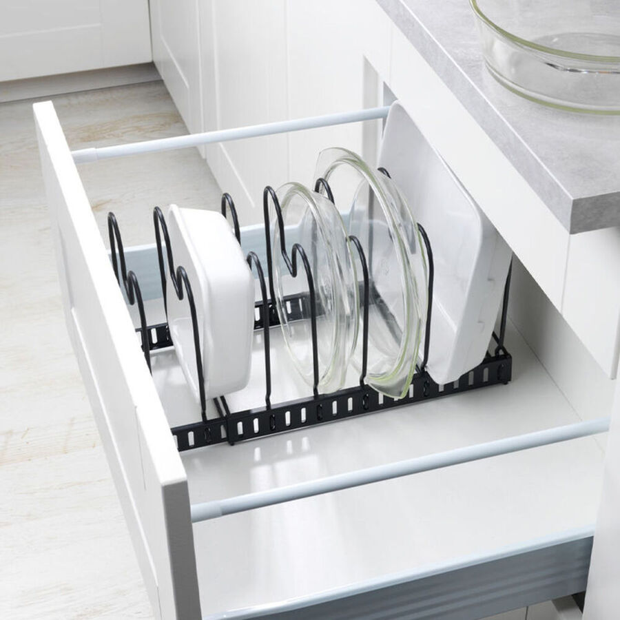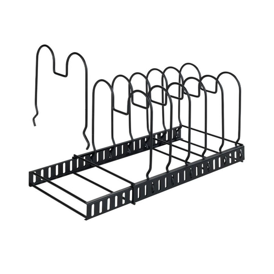 Dank 12 variabel verstellbarer Drahtbügel bewahrt der ausziehbare Metallhalter Pfannen, Deckel, Schneidbretter, Backformen, Tabletts unterschiedlicher Größen auf. Teilbar, passt in Schränke und große Schubladen ab 30 cm Tiefe. Auch als Abtropfgestell verwendbar.