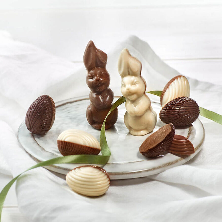 Einmal im Jahr entstehen in feinster Chocolatier-Kunst diese liebevoll gefertigten Ostereier und Osterhasen mit feinsten Füllungen. Süße Häschen und zweifarbige Relief-Eier aus edelstem Nougat mit feinem Vanillearoma umhüllt dunkle und weiße oder zart schmelzende Milchschokolade. Sie sind eine köstliche kleine Leckerei zum Kaffee oder Digestif. Wunderbar lassen sich die Nougatpralinen mit feinen Desserts und Eis kombinieren. Auch für delikate Dekorationen auf Gebäck, Torten und Kuchen sind die hübschen Kunstwerke bestens geeignet. Hergestellt aus frischen, rein natürlichen Zutaten.