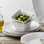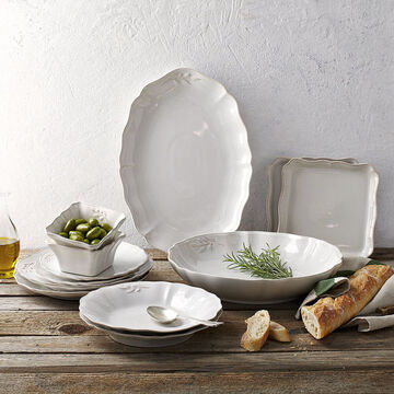 Seit jeher ist der Olivenbaum ein besonderes Symbol für die kulinarische Welt des Mittelmeerraumes. Seine Blätter und Früchte zieren den fein ausgearbeiteten Reliefrand dieses stilvollen Geschirrs. Mit elegantem Charme vermittelt es gehobenen Lebensstil. In aufwändiger Handarbeit entsteht die schöne Patina der Geschirrränder.