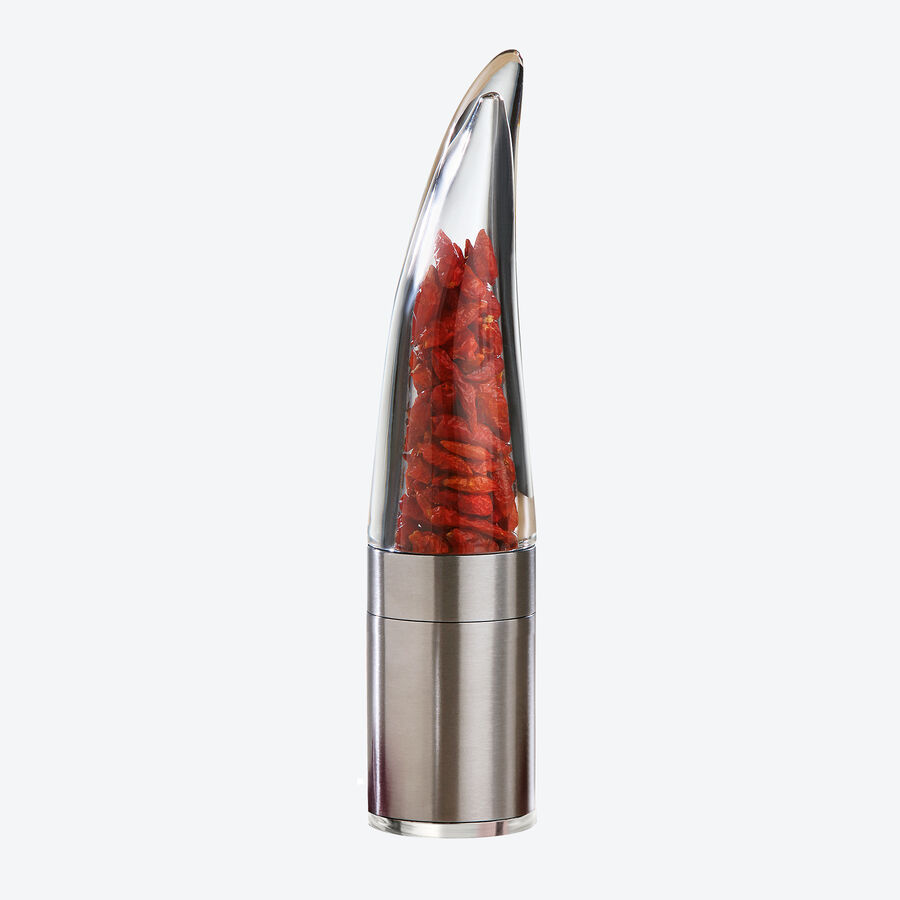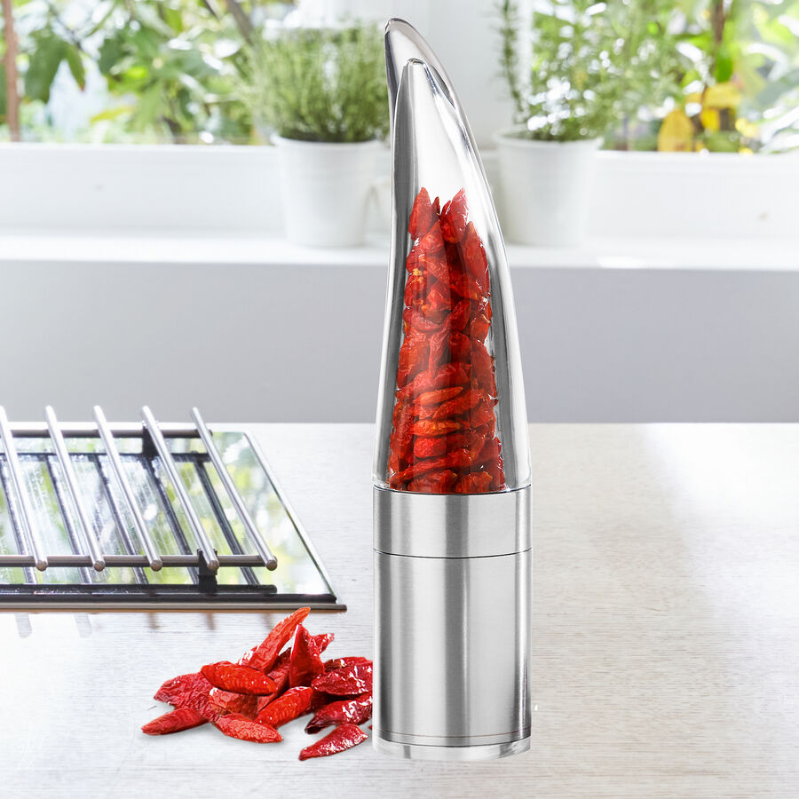 Chili Mühle - Edelstahl mit Acryl-Vorratsbehälter, scharfes Schneidwerk, fein gemahlenes Chilipulver, 22 cm, Ø 4,5 cm, neuartige Verschlussmechanik