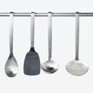 Aus gebürstetem, 2,5 mm starkem Edelstahl, ergonomisch geformte Griffe aus einem Guss gefertigt (außer Pfannenwender), formstabil, lebensmittelecht, säurebeständig, spülmaschinenfest. Pfannenwender 33 cm lang, Nylon-Wendefläche 12,5 x 8,5 cm (B/T), Suppenkelle 32 x 10,5 cm (B/H), Servierlöffel 34 x 7 cm (B/H), Kelle 10,5 x 7 cm, Schaumlöffel 32 x 11,5 cm (B/H), Schaufelfläche Ø 11,5 cm.