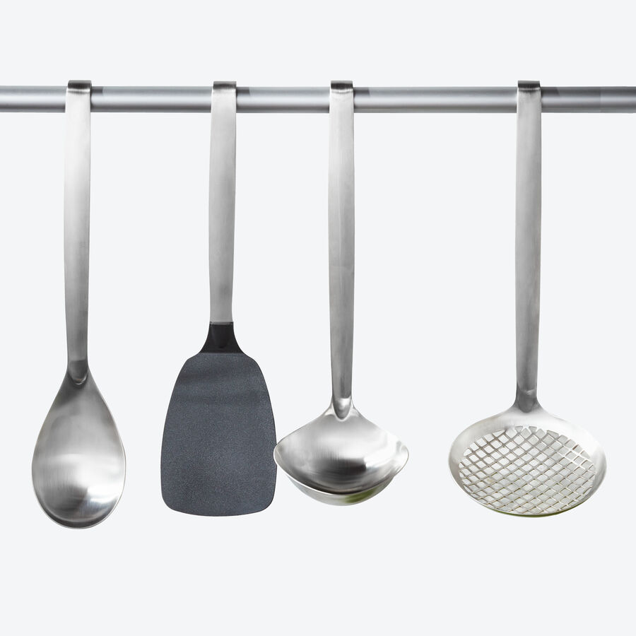 Nach höchsten Ansprüchen an Qualität und Funktion fertigt Hagen Grote diese hochwertigen Küchenhelfer, die in keiner gut ausgestatteten Küche fehlen dürfen. Pfannenwender: Flexible Nylon-Wendefläche, hebt auch empfindliche Speisen leicht, sicher, unversehrt, schützt Ihre Pfannen vor Kratzern. Suppenkelle: Schöpfen, gießen und servieren Sie Suppen, Eintöpfe, Saucen so, dass nichts daneben tropft. Servierlöffel: Perfekt reichen Sie damit klassische Beilagen, Aufläufe, Gemüsegerichte. Schaumlöffel: Große, grobmaschige Schaufelfläche mit extra hohem Rand. Ideal zur Entnahme empfindlicher Speisen wie Ravioli, Gnocchi, Klöße, Frittiertem aus Garflüssigkeit, Frittierfett.