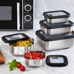 Geben Sie Vorräte vom Kühlschrank direkt in die Mikrowelle: Das Spezialventil im Deckel lässt den Dampfdruck beim Erwärmen entweichen. So können Sie die mit einer speziell patentierten Legierung ausgestatteten Edelstahldosen auch mit Deckel in der Mikrowelle verwenden. Das leichte, robuste Material ist temperaturbeständig von -20°C bis 300°C, mit Deckel bis zu 100°C. Für die Verwendung im Ofen muss nur der Deckel abgenommen werden. Auch als Back- oder Auflaufformen sind die Edelstahldosen optimal geeignet. Mit zwei verschiedenen Formen und jeweils drei Größen haben Sie immer die richtige zur Hand. Edelstahl mit Kunststoff-Deckel (BPA-frei), mikrowellengeeignet und backofenfest bis 300 °C (mit Deckel bis 100 °C), ohne Deckel spülmaschinengeeignet, platzsparend stapelbar.