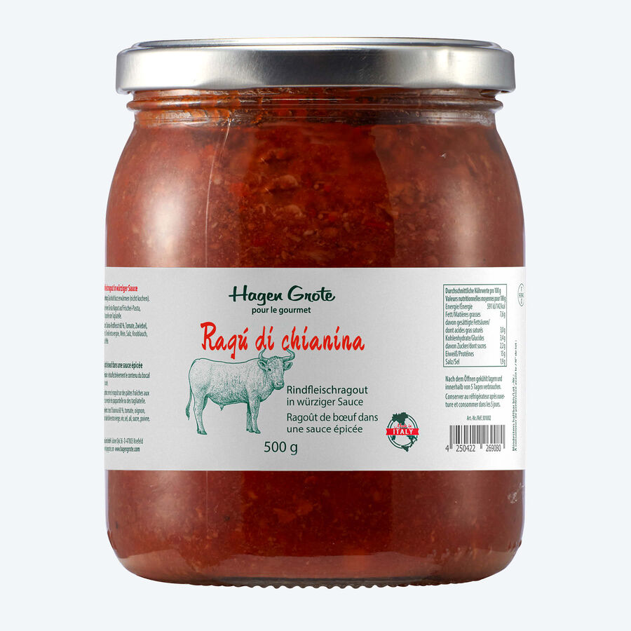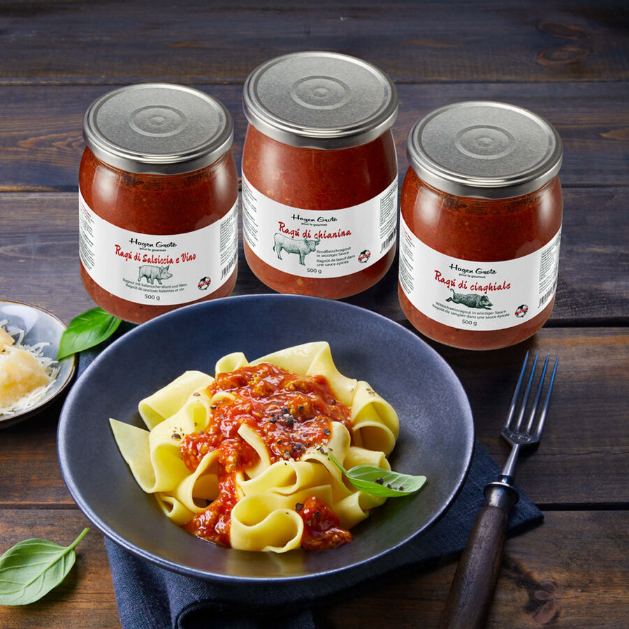 In Herbst und Winter ist Ragú di chianina, Rindfleischragout in würziger Sauce, mit den besonders breiten Pappardelle Bandnudeln, ein Klassiker der italienischen Küche. Beim toskanischen Chianina handelt es sich um das weltweit größte und älteste Fleischrind. Es zeichnet sich durch sein besonders zartes, saftiges Fleisch und eine feine Marmorierung aus. In unserer Genussmanufaktur marinieren wir nach traditionellem Rezept frisch ausgelöstes Fleisch 12 Stunden in Gemüsen und Wein. Nach dem Anbraten werden Gemüse, regionale Tomaten und Gewürze wie Rosmarin und Salbei hinzugegeben. Mit schwarzen Oliven und etwas Kakao verfeinert kochen wir daraus in mehreren Stunden ein köstliches Ragout.
