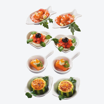 Es muss gar nichts Ausgefallenes sein, um in diesen Formen besonders hübsch zu wirken. Eine Kleinigkeit wird darin zur überraschenden Leckerei. Amuse-bouche oder amuse-gueule heißen diese kleinen Vor-Vorspeisen in Frankreich. Wirkungsvoll unterstützen die ausgeprägten Formen das hübsche Anrichten und Dekorieren.