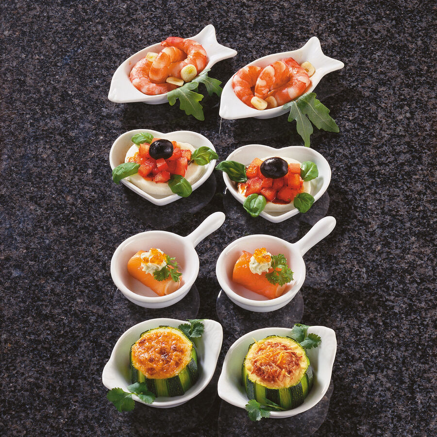 Es muss gar nichts Ausgefallenes sein, um in diesen Formen besonders hübsch zu wirken. Eine Kleinigkeit wird darin zur überraschenden Leckerei. Amuse-bouche oder amuse-gueule heißen diese kleinen Vor-Vorspeisen in Frankreich. Wirkungsvoll unterstützen die ausgeprägten Formen das hübsche Anrichten und Dekorieren.
