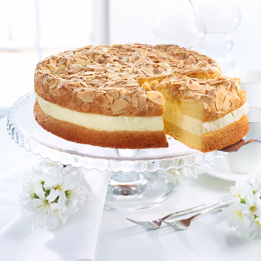 2 Springform fetten und Teig einfüllen. Mandelblättchen obendrauf verteilen. Im vorgeheizten Ofen bei 180 °C Ober-/Unterhitze etwa 30 Minuten auf 2. Schiene backen. Boden anschließend auskühlen lassen, dann horizontal teilen.