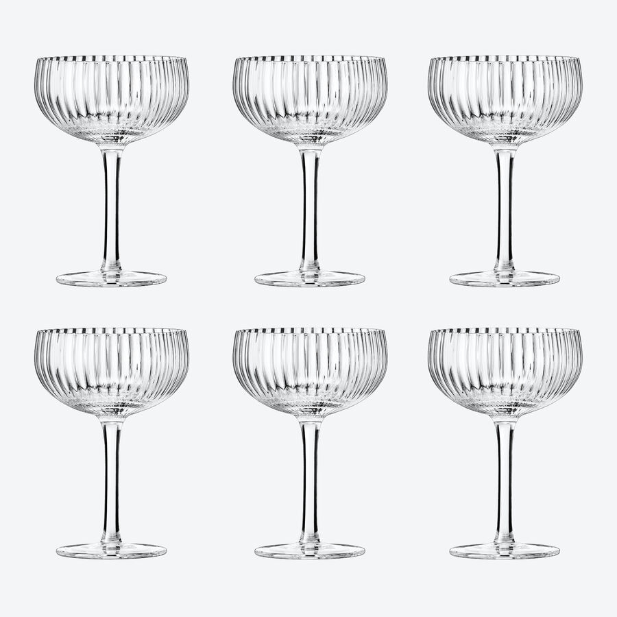 • Ins Glas gepresste feine geschwungene Linien erzeugen faszinierende Lichtspiele und damit einen besonderen Blickfang. Die Cocktailschale entspricht der Form einer klassischen Coupette mit halbkugelartigem Kelch. Sie ist ideal für "Shortdrinks" wie Manhattan, Margaritas oder auch für Champagner.