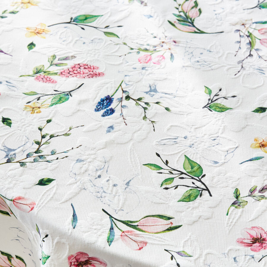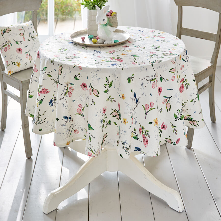 Zarte Hasen und Osterlämmer tummeln sich zwischen bunten Frühlingsblüten wie Tulpen und Narzissen sowie feinen Weidenkätzchen. Durch den hochwertigen Digitaldruck werden die Motive brillant und realistisch wiedergegeben. Der schwere Stoff präsentiert sich zudem mit floraler Reliefmusterung, die durch aufwendiges Weben mit mehreren Kettfäden entsteht. Dieses Verfahren macht die Tischdecken besonders strapazierfähig und robust. Durch ihre stärkere Struktur schützen sie empfindliche Oberflächen besonders wirkungsvoll.