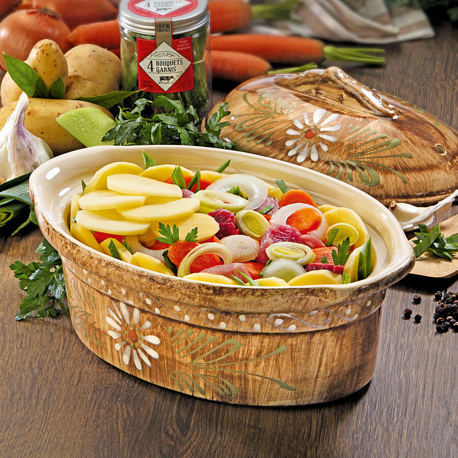 2 Kartoffeln schälen und in feine Scheiben schneiden. Den Boden und die Seiten der Baeckeoffe-Form mit den Kartoffelscheiben auskleiden. Fleisch, Gemüse, Kräuterstrauß und Marinade in die Mitte schichten und kräftig mit Salz und Pfeffer würzen. Mit einer Lage Kartoffelscheiben bedecken.