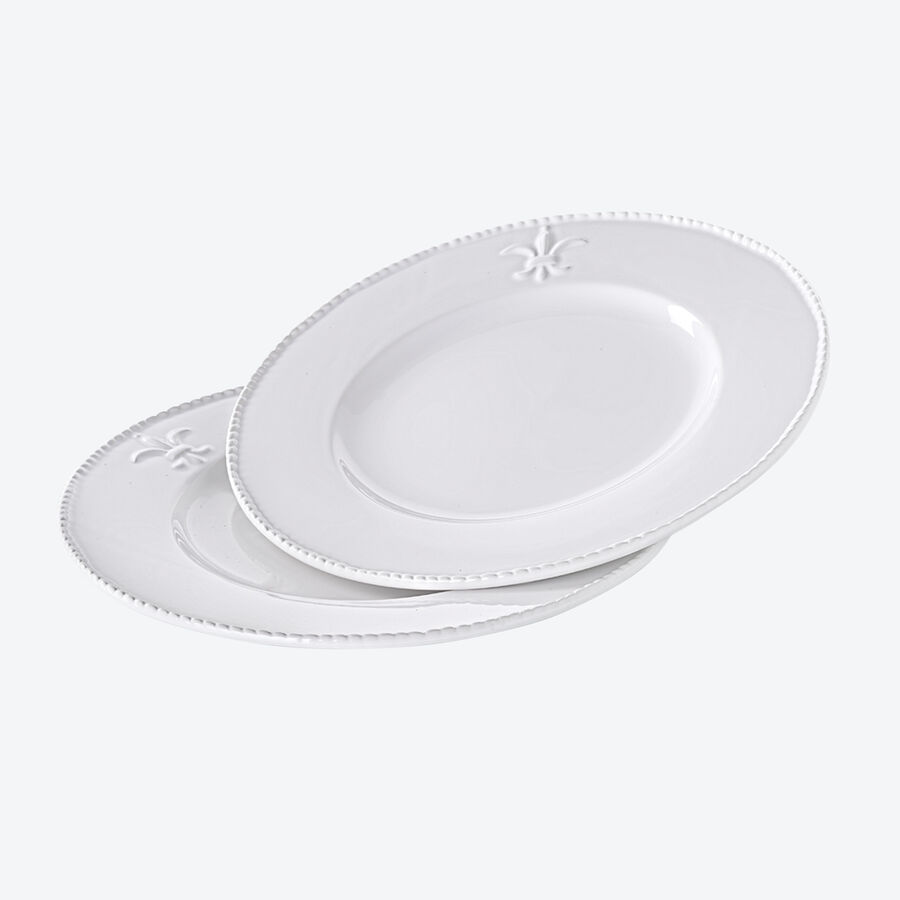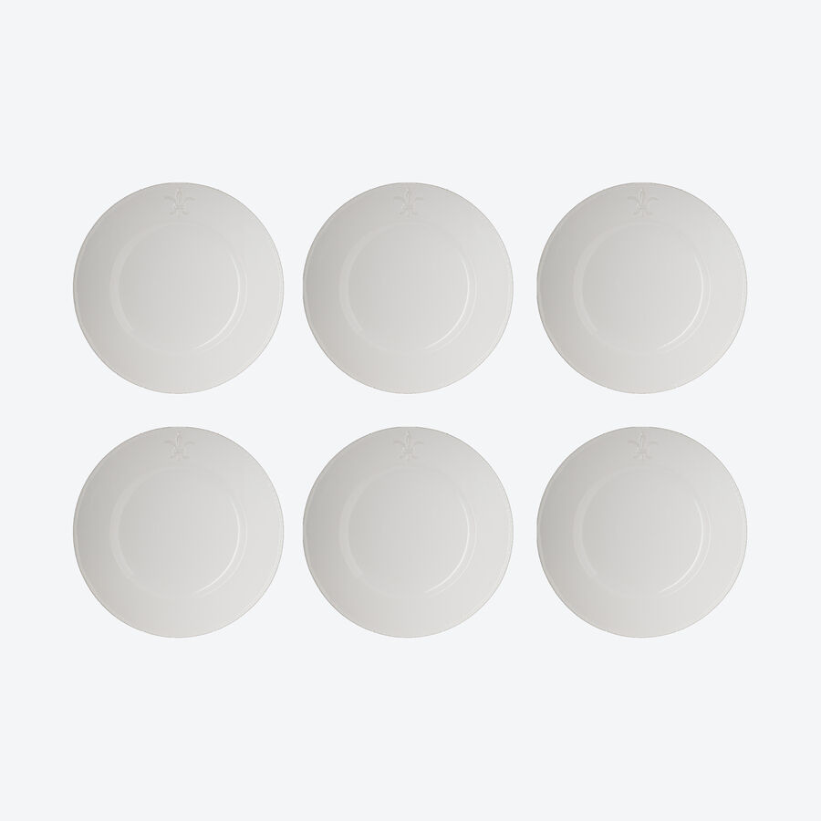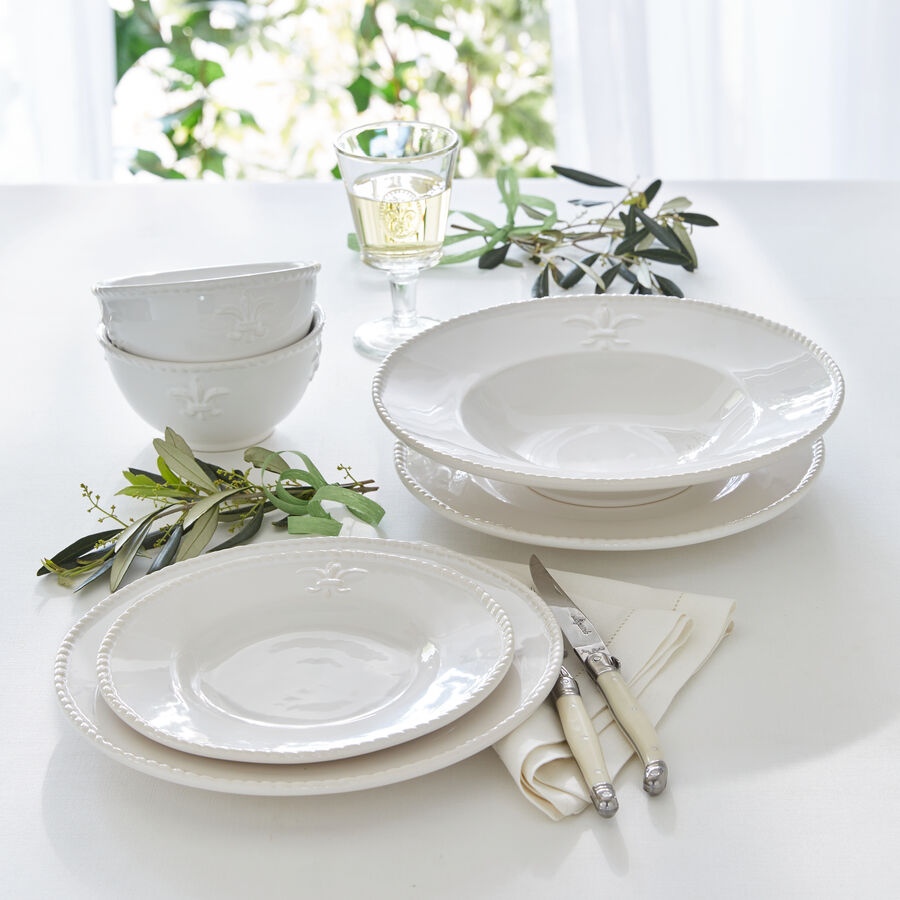 Zur guten Küche gehört edles Geschirr. Seit dem 12. Jahrhundert ist die Lilie das Symbol der französischen Aristokratie und repräsentiert königliche Lebensart. In plastisch fein hervorgehobener Darstellung ziert die heraldische Lilienblüte, auch als Fleur-de-Lys bekannt, dieses edle Fayence Geschirr. Der aufwendig gestaltete Kordelrand unterstreicht die kultivierte Anmutung. Es fördert als vorzüglicher Rahmen den optischen Eindruck schön angerichteter Speisen der gehobenen Kochkunst. Genießen Sie täglich und bei festlichen Anlässen die dezent feudale Ausstrahlung dieses Geschirrs. Reinweißes Fayence Geschirr, mikrowellengeeignet, spülmaschinenfest.