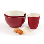 Perfekt zum Teigkneten oder -rühren, Sahneschlagen oder zur Aufbewahrung sind diese eleganten und hochwertigen Rührschüsseln aus Melamin. Sie zeichnen sich durch eine besondere Stabilität und eine glänzende Oberfläche aus. In ihrer Beschaffenheit erinnern sie an Porzellan, nur sind sie viel leichter und strapazierfähiger. Mit ihrer edlen Form und dem zweifarbigen Look - außen rot und innen cremefarben - sind sie moderne Klassiker. Das Original gehört zur ständigen Sammlung des Museum of Modern Art in New York. Hoher Rand, stabiler Griff, tropffreier Ausgießer, rutschfester Bodenring, säure- und hitzebeständig bis 70 °C, spülmaschinenfest.