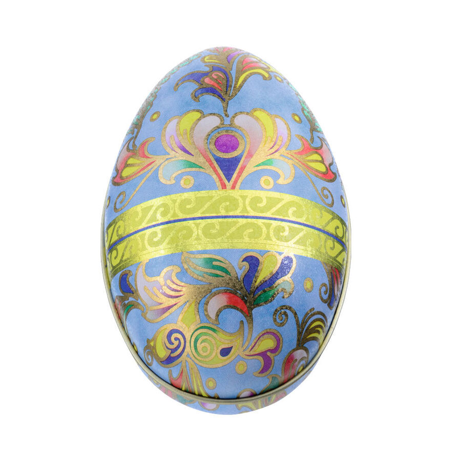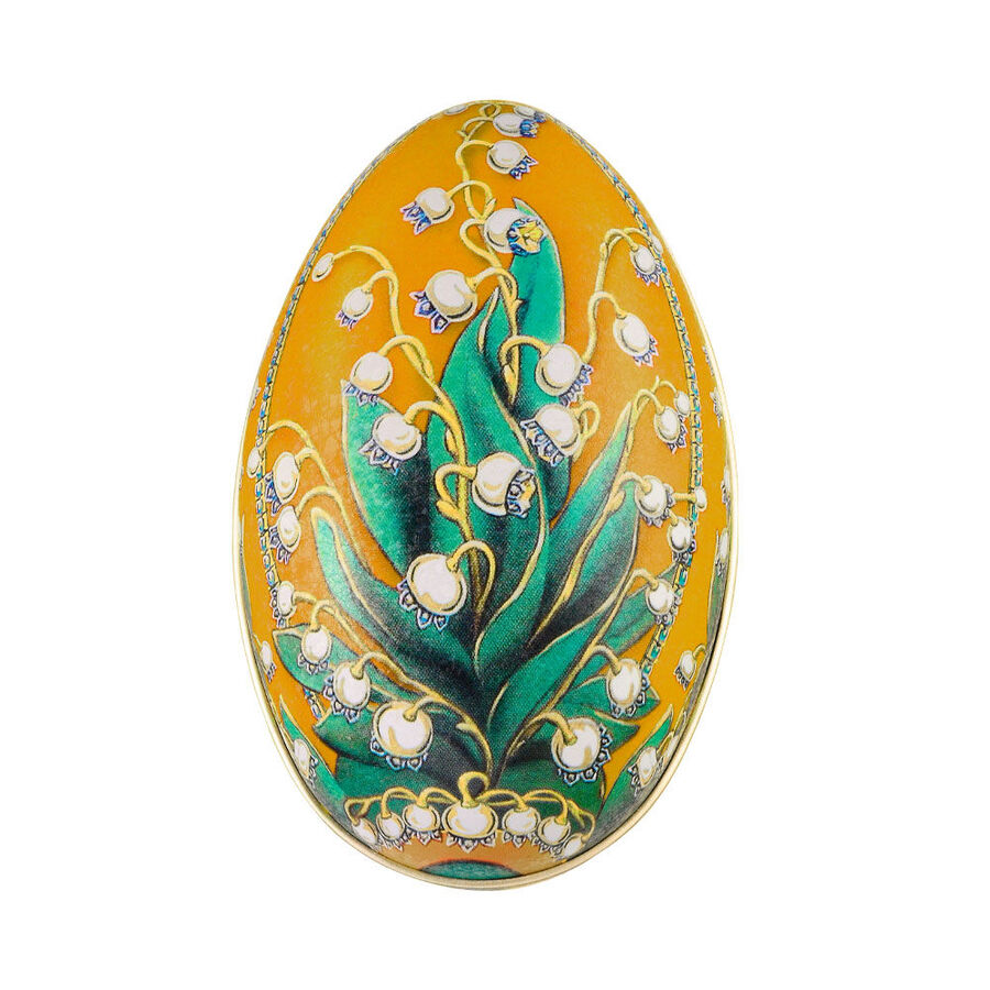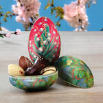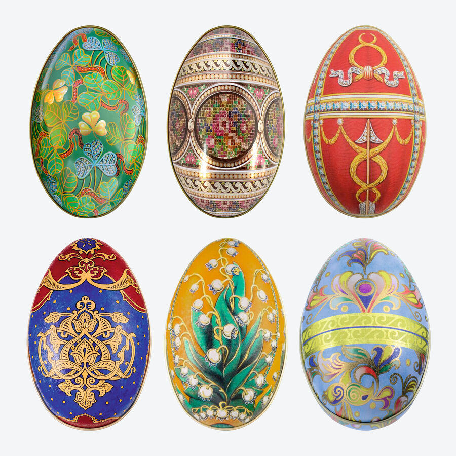 Fabergé Oster-Überraschungs-Eier mit Pralinenfüllung. Der Goldschmied Peter Carl Fabergé schuf 1882 die heute unbezahlbaren Eier. Zu jedem Osterfest entstand ein neues Ei in unübertroffener Goldschmiedekunst. Den goldenen und juwelenbesetzten gefüllten Originalen, sind diese Oster-Überraschungs-Eier nachempfunden. Gefüllt sind Sie mit hochfeinen Eier-Trüffelpralinen. Die köstlichen Pralinen werden vom Chocolatier exklusiv für uns von Hand gefertigt und einzeln aromageschützt verpackt. Sie enthalten feinste Füllungen aus Karamell-Sahne, Rotwein-Ganache, Nougat, Irish Coffee und Eierlikör-Creme in delikaten Hüllen aus Zartbitter-, weißer und Vollmilch-Schokolade. Fabergé Metall-Eier 11,5 cm hoch, 6 exklusive Motive (Auswahl erfolgt zufällig, Farb- und Motivwünsche nicht möglich), gefüllt mit jeweils 100 g Trüffel-Eierpralinen.