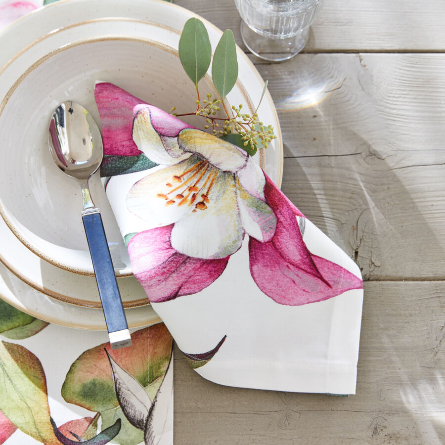 Großformatig zieren ausdrucksstarke, florale Motive in kräftigen, sommerlichen Flieder- und Grüntönen diese eindrucksvolle Tischwäsche. Seit über 60 Jahren fertigt die Weberei in streng limitierten Auflagen elegante Tischwäschen, deren Farbgebung und Dessins von mediterraner Flora und Fauna inspiriert sind. 100 % Baumwollsatin, fleckgeschützt durch hochwertigen Faserschutz, Maschinenwäsche 40 °C (beim ersten Waschgang Kaltwäsche).
