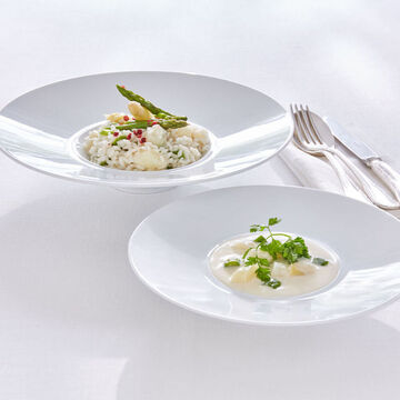 Von anmutiger Eleganz sind die Porzellan-Teller mit dem wunderbar breiten Rand und dem zarten Innensteg, der den Spiegel als eindrucksvolle Servierfläche inszeniert. Die Gourmetteller bieten Ihnen viel Raum, um delikate Speisen mit wenig Aufwand fantasievoll zu dekorieren. Garnieren Sie mit frischen Kräutern und Früchten oder zeichnen Sie darauf effektvolle Muster mit Saucen und Cremes. So werden die fließenden Linien des Geschirrs unterstrichen und zum besonderen Designelement für Tisch oder Tafel. Isostatisch gepresst und im Doppelbrandverfahren hergestellt, vereint die aus edlem Porzellan gefertigte Tellerserie graziles Design mit der robusten Beschaffenheit des Gastronomiegeschirrs.
