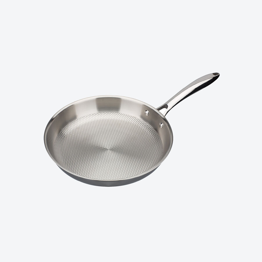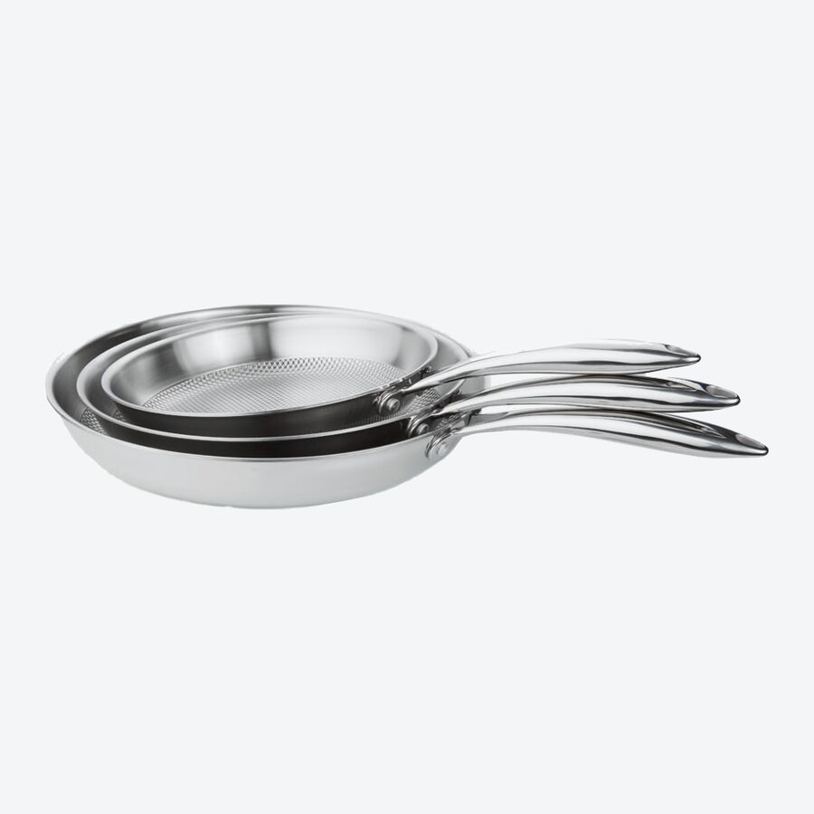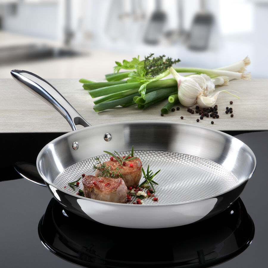 Ihr Geheimnis liegt in der thermischen Abstimmung verschiedener Metalle wechselnder Stärke. Die äußere Bodenschicht aus induktionsfähigem Edelstahl bleibt selbst bei hoher Hitze absolut plan. Für erstklassige Wärmeleitfähigkeit sorgt die innere Aluminiumschicht. Von entscheidender Bedeutung ist jedoch die Edelstahl- Wabenstruktur. Beim scharfen Anbraten bräunt sie absolut gleichmäßig. In ihren Vertiefungen entweicht Wasserdampf, der das richtige Anbraten und Bräunen empfindlich stören würde. Nichts klebt auf dieser Struktur, Metallwender und spitze Messer können ihr nicht das Geringste anhaben.