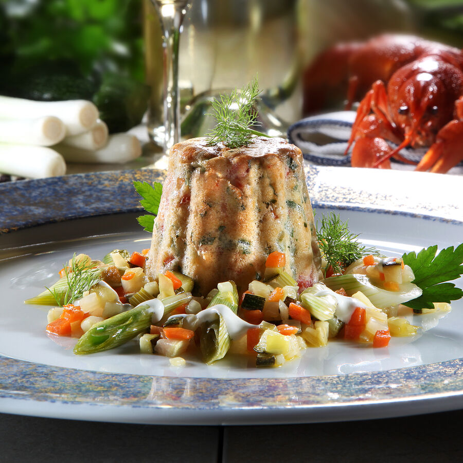 Die Flusskrebs-Biskuits vorsichtig aus der Form lösen und auf vorgewärmten Tellern anrichten. Das Gemüse ringsum verteilen, leicht mit der Noilly-Prat-Sauce überziehen und alles mit etwas Petersilie garnieren.