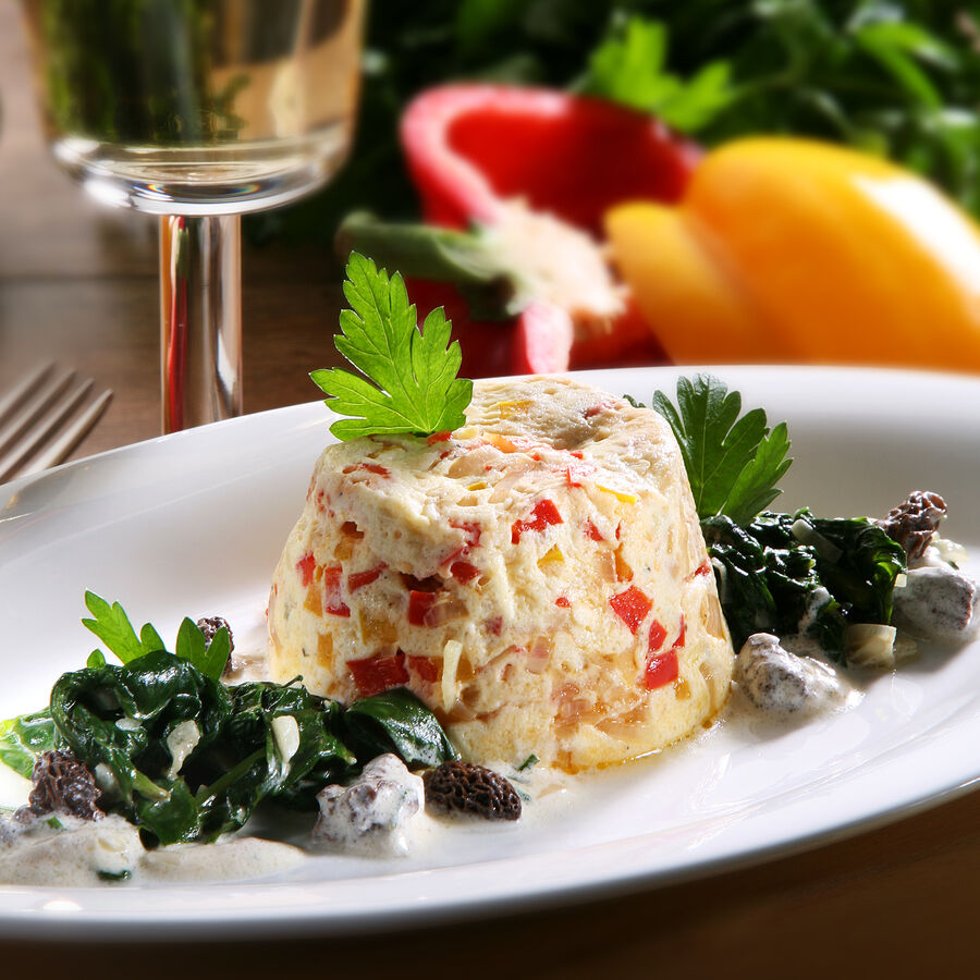 4 Zum Schluss die Petersilie fein gehackt unter die Sauce heben. Fertigstellen und Anrichten Die Flusskrebs-Flans vorsichtig aus den Förmchen lösen und mit Blattspinat auf Tellern anrichten. Mit Morchelrahmsauce umgießen und mit einigen Blättchen Petersilie garnieren.