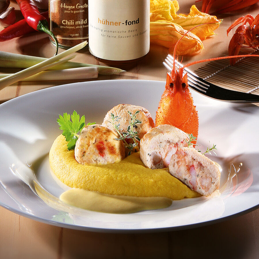 Das Kürbispüree in der Mitte vorgewärmter Teller anrichten. Flusskrebs-Geflügel-Bällchen darauf verteilen und etwas Zitronengras-Kürbis-Sauce angießen. Mit Krebsnasen, Thymian und Petersilienblättchen garnieren.