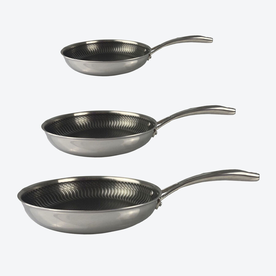 Formschönes 3- tlg. Edelstahl-Pfannenset mit wärmeleitfähigem 3-lagigem Boden