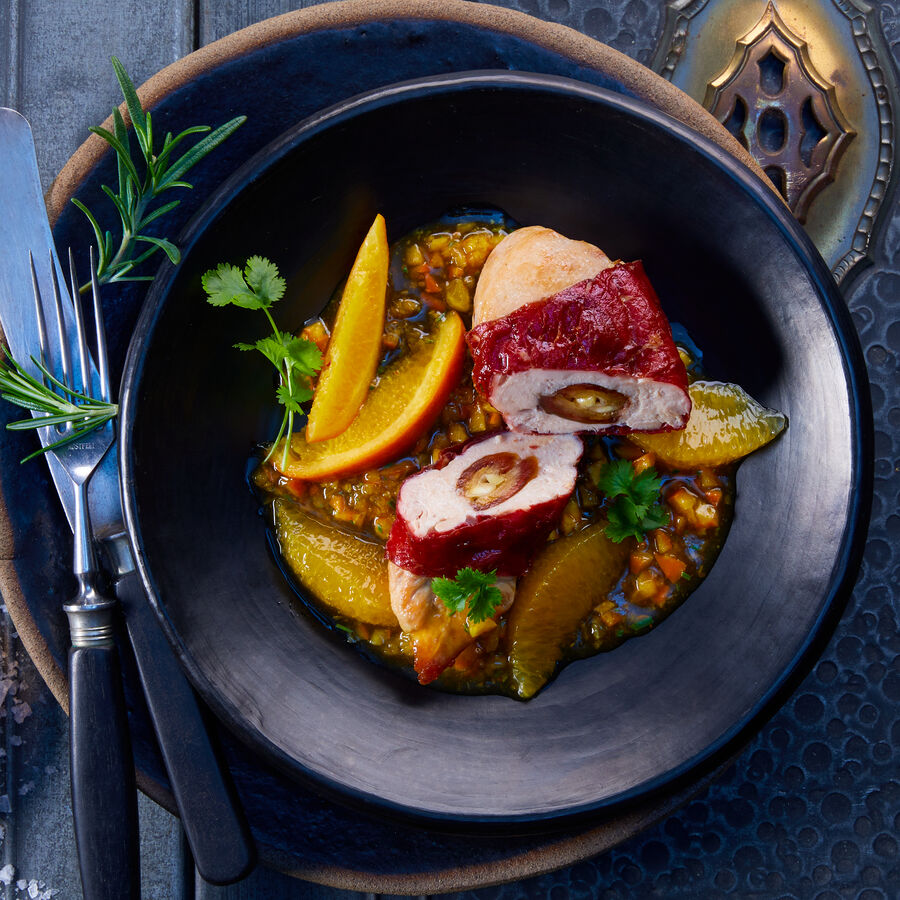 Gefüllte Dattel-Perlhuhnbrüstchen auf Würz-Orangen-Sauce