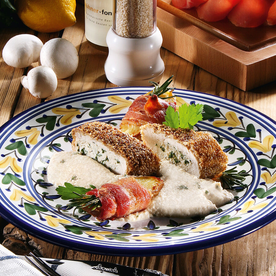 • Produktbild für 'Gefüllte Hähnchenbrust in Sesamkruste auf Champignonpüree mit Bacon-Kruste'