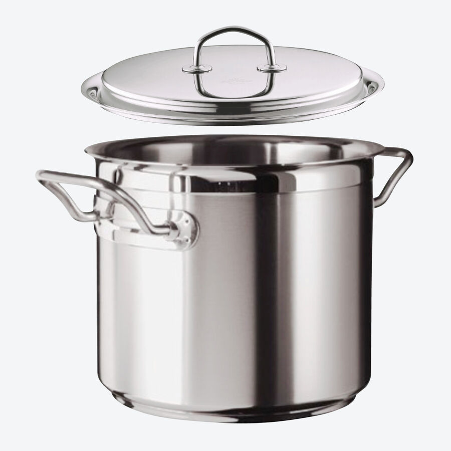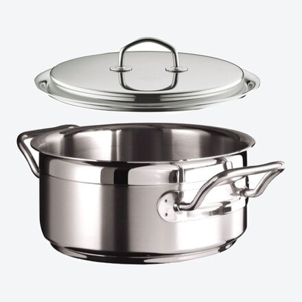 Der 8,8 mm dicke Mehrschicht-Boden mit 6 mm eingekapseltem Aluminiumkern speichert und verteilt die Hitze absolut gleichmäßig und hält sie konstant. Die nahtlos runde Form sorgt für bequemes Umrühren, nichts setzt an. Zuverlässig dicht schließt der Hochraum-Aromadeckel. Optimal für kleine Portionen. Edelstahl,16 x 16 x 14 cm (B/T/H), mit Deckel und Griffen 25 x 18 x 20,5 cm (B/T/H), 2,7 l Inhalt, 8,8 mm Mehrschichtboden, 6 mm Aluminiumkern, Schüttrand, Isoliergriffe, ofenfest bis 250 °C, spülmaschinenfest. Für alle Herdarten inklusive Induktion.