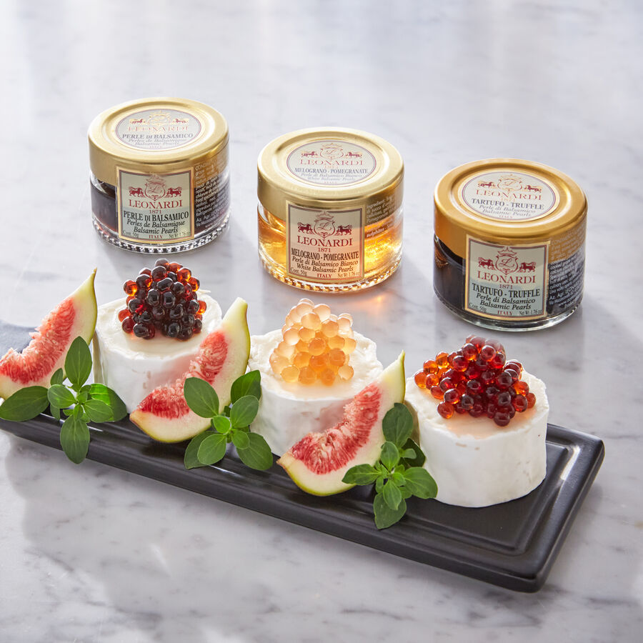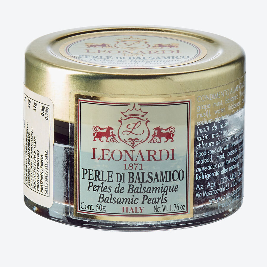 Inspiriert durch die Molekularküche und hergestellt nach einem exklusiven Leonardi-Rezept, tragen diese zarten Kugeln den besten Aceto Balsamico des Hauses in sich. Auf der 1874 von Giuseppe Leonardi gegründeten Acetaia wird seit vier Generationen original Aceto Balsamico di Modena hergestellt. Dazu wird zuerst Traubenmost eingekocht - 70 Liter Traubenmost ergeben 3 Liter Balsamico - der dann anschließend noch jahrelang in verschiedenen Holzfässern reift. Mit der Verdunstung nimmt die Konzentration der Aromen zu und der Aceto Balsamico wird, wie ein guter Wein, immer kostbarer. Das Geschmackserlebnis der Aceto Balsamico Perlen offenbart sich nach einem leichten Biss auf ihre zarte Hülle. Denn dann tritt das einzigartige, fein säuerliche Aroma in Erscheinung, das alle Speisen wunderbar verfeinert. Ganz gleich, ob Tomaten mit Mozzarella, gegrilltes Fleisch, Meeresfrüchte und Gemüse oder Eis, Süßspeisen und Obst - die Balsamico Perlen setzen köstliche Akzente und verzaubern auch optisch jeden Genießer.