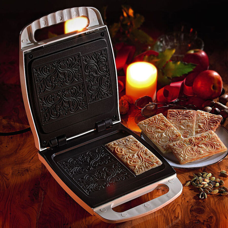 Hartkunststoffkorpus, 21 x 27 x 8 cm hoch, Aluminium- Backplatten mit altnorwegischem Muster, optimale Hitzeverteilung für knuspriges Backergebnis, hochwertige Antihaftbeschichtung. Zur Überprüfung des Bräunungsgrades darf der Deckel geöffnet werden, wiegt ca. 1,9 kg, 230V/1.000W, 1,5 m Anschlusskabel, rutschfest gummierte Füße, geprüfte Sicherheit, kommt mit norwegischem Originalrezept.
