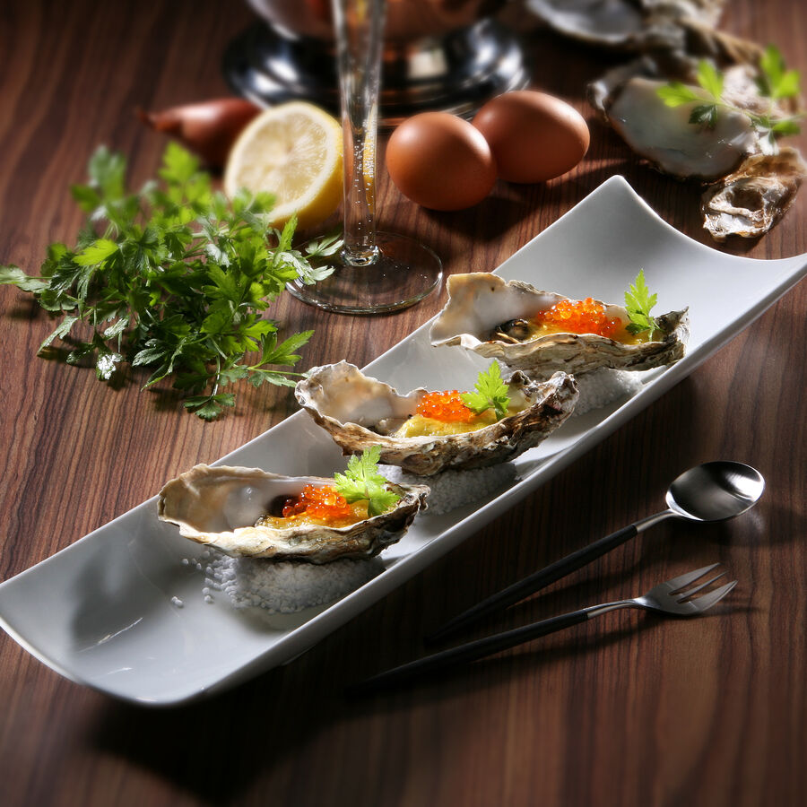Die gratinierten Austern aus dem Ofen nehmen und mit 1 Löffel Kaviar und etwas Petersilie garniert servieren.
