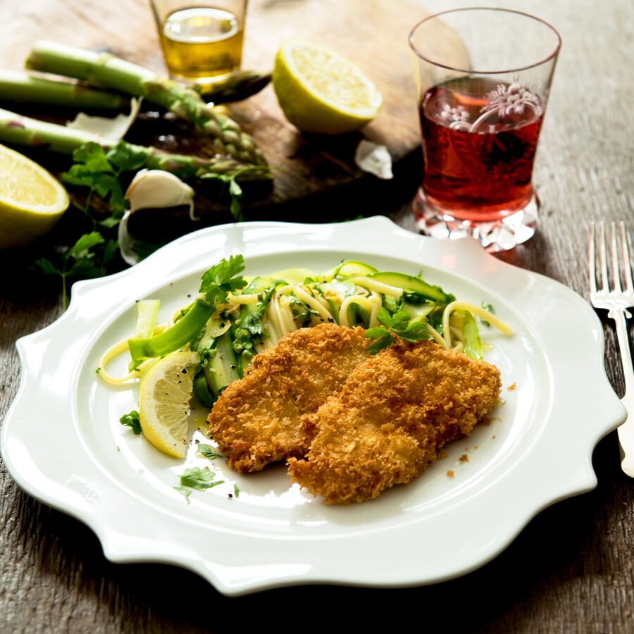 Petersilienblättchen zupfen, fein hacken und unter die Spargelnudel-Linguine heben. Auf vorgewärmten Tellern anrichten und die Hähnchenbrust-Schnitzel zufügen.