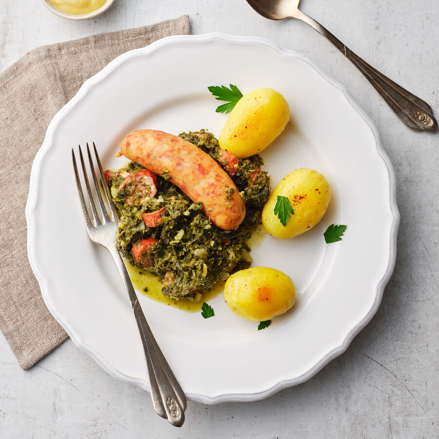 Die Kartöffelchen gar kochen, pellen und in Butter ringsherum braun braten. Mit Salz würzen. Grünkohl, Pinkel und Kartoffeln auf heißen Tellern anrichten. Senf getrennt dazu reichen.