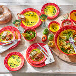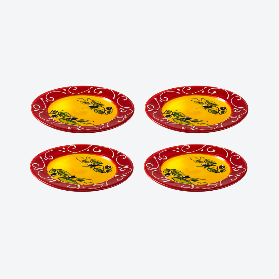Maurische Stilelemente prägen bis in die Gegenwart Kunst und Handwerk dieser ehemals arabischen Stadt. An Safran und Paprika erinnern die sommerlich warmen Erdfarben der schönen Dessert- und Salatteller. Wunderbar harmonisch passen dazu die typischen Olivenmotive. In traditioneller Handarbeit wird jeder Teller einzeln von Hand bemalt. Gebrannt werden die Teller bei fast 1.000 °C nach modernsten technischen Verfahren. Daher ist das robuste Fayence-Geschirr mit lebensmittelgerechter Glasur